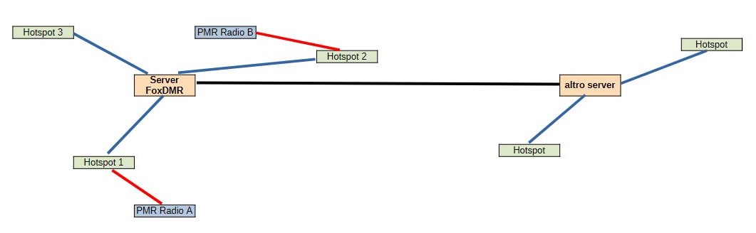 Il server, a sua volta, è interconnesso con altri server. In questo modo diverse maglie costituiscono una rete di comunicazione radio. Non esiste un server MASTER che comanda sugli altri e tutti i server sono allo stesso livello, così come non esiste un hotspot privilegiato rispetto agli altri hotspot collegati allo stesso server.